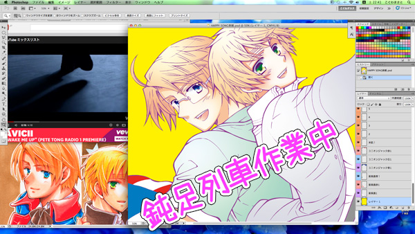 ちなみに表紙彩色途中↓(右側目に痛い黄色)で腕が死にました